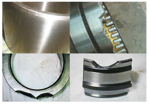 所謂卡傷是由于在滑動面損傷產(chǎn)生的部分的微小燒傷匯總而產(chǎn)生的表面損傷?;?面、滾動面圓周方向的線狀傷痕。滾子端面的擺線狀傷痕,靠近滾子端面的軸環(huán)面的卡 傷。造成卡傷的主要原因有:過大載荷、過大預(yù)壓、潤滑不良、異物咬入、內(nèi)圈外圈的 傾斜、軸的撓度、軸、軸承箱的精度不良等??梢酝ㄟ^適當(dāng)?shù)念A(yù)壓、改善潤滑劑和潤滑 方法、提高軸、軸承箱的精度來解決。