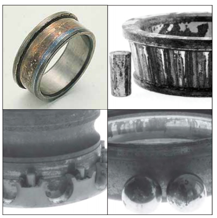 對稱位置剝落表現(xiàn)在內(nèi)圈為周圍環(huán)帶剝落,而外圈呈周向?qū)ΨQ位置剝落(即橢圓的短 軸方向),其產(chǎn)生原因主要是因為軸承箱孔橢圓過大。當(dāng)軸承壓入橢圓偏大的軸承箱孔中 時,使軸承外圈產(chǎn)生橢圓,在短軸方向的游隙明顯減少甚至負(fù)游隙。軸承在載荷的作用 下,內(nèi)圈旋轉(zhuǎn)產(chǎn)生周向剝落痕跡,外圈只在短軸方向的對稱位置產(chǎn)生剝落痕跡,這是該 軸承早期試銷的主要原因。采取的對策是提高軸承箱孔加工精度。